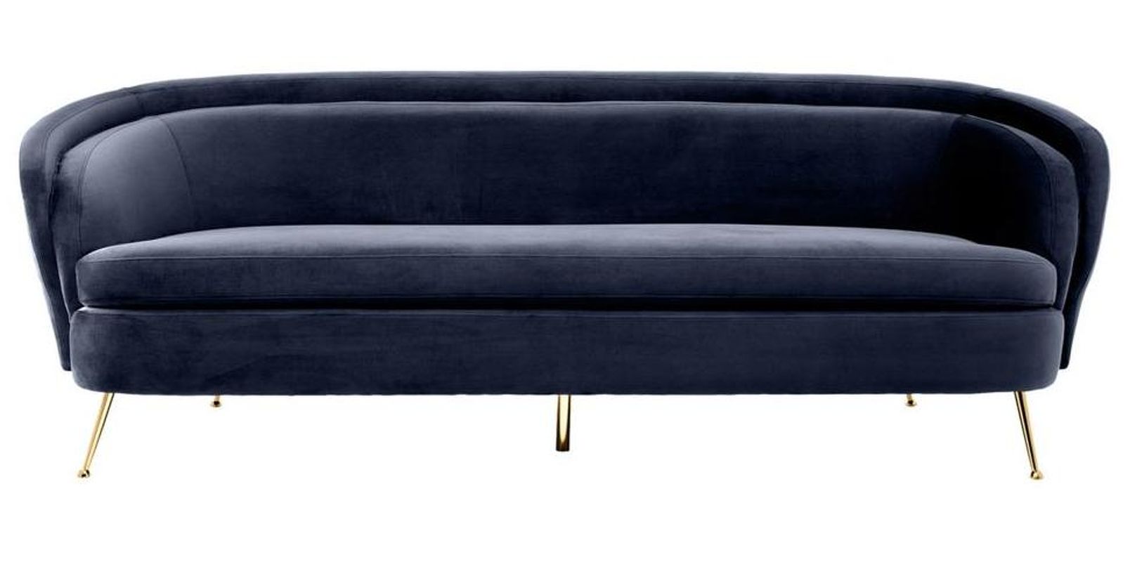 Атмосферный темно-синий вельветовый диван от популярной фабрики Eichholtz (Нидерланды) в стиле ар-деко. С низкой плавной спинкой, переходящей в закругленные подлокотники. Ножки — латунь.