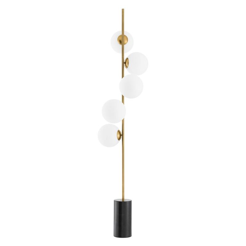 Этот современный торшер придаст по-настоящему современный вид вашей гостиной или спальне. Он оснащен 5 сферическими абажурами из прозрачного стекла на стержне из античной латуни и эффектно контрастирующим цилиндрическим основанием из черного мрамора.