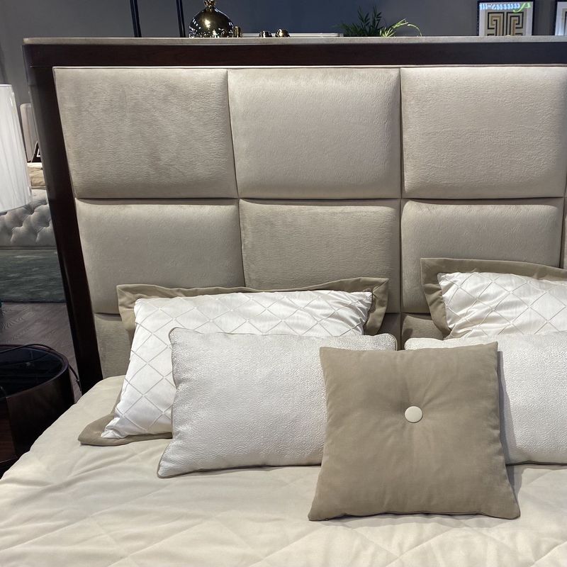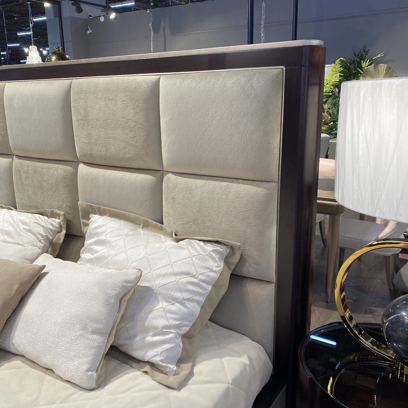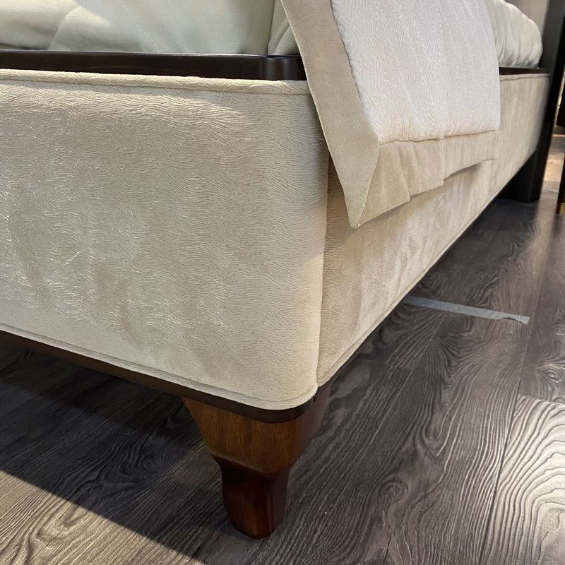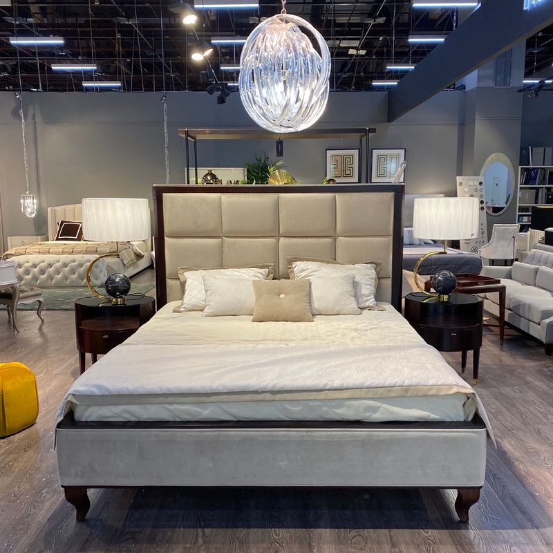 Двуспальная кровать с традиционным европейским силуэтом. Модель имеет изогнутые ножки и темный деревянный каркас. Изголовье имеет прямоугольную стежку, база также оформлена тканью. Оттенок можно выбрать из ассортимента фабрики.