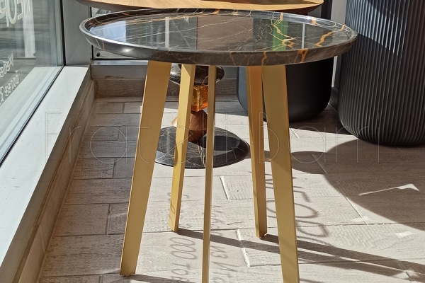 Круглый приставной столик на прямых металлических ножках выполнен в современном стиле. Дополнен мраморным топом с низким бортиком.