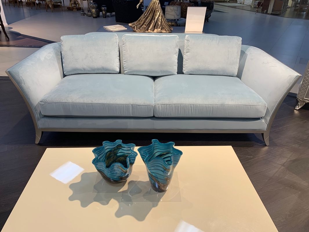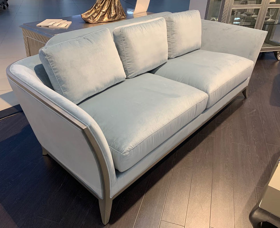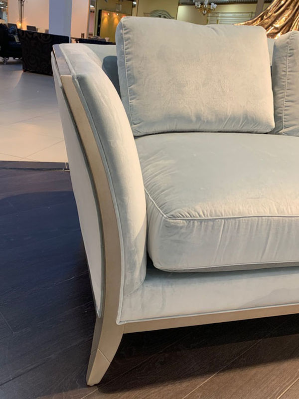 Выполнен из массива дерева. Обит тканью из ассортимента фабрики в голубых тонах. Тип ткани - велюр. Состав ткани - 100% полиэстер.