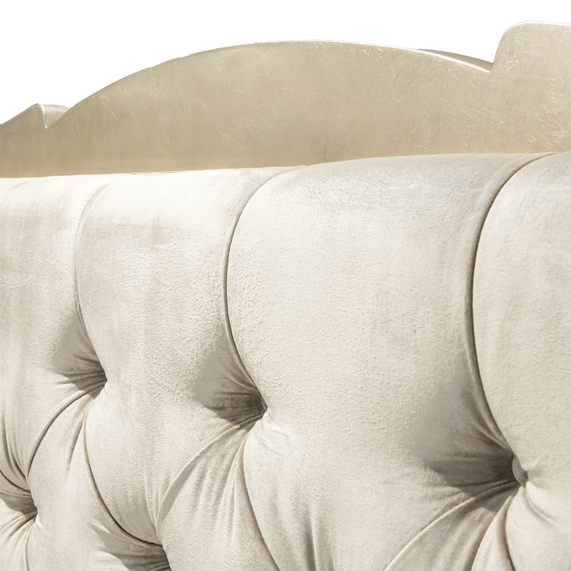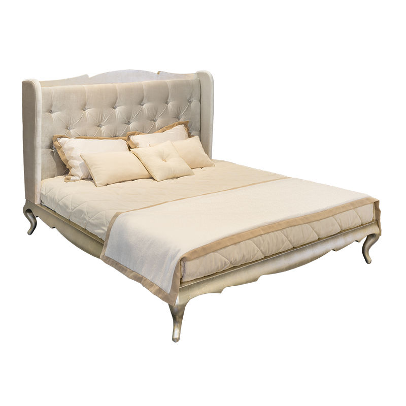 Ножки, база и «корона» изголовья в отделке сусальное серебро, покрытое лаком шампань методом ручного нанесения.