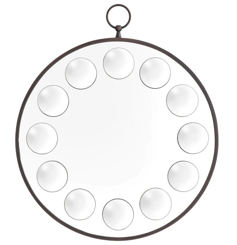 Круглое зеркало выполнено из латуни, задняя стенка из МДФ. Зеркальная панель по периметру декорирована выпуклыми вставками.