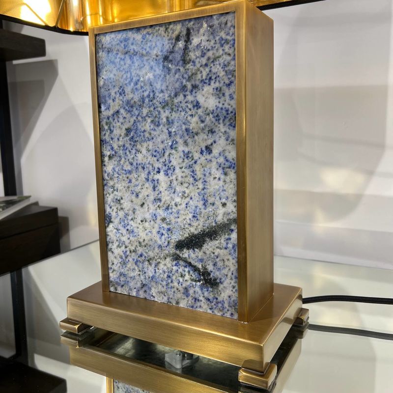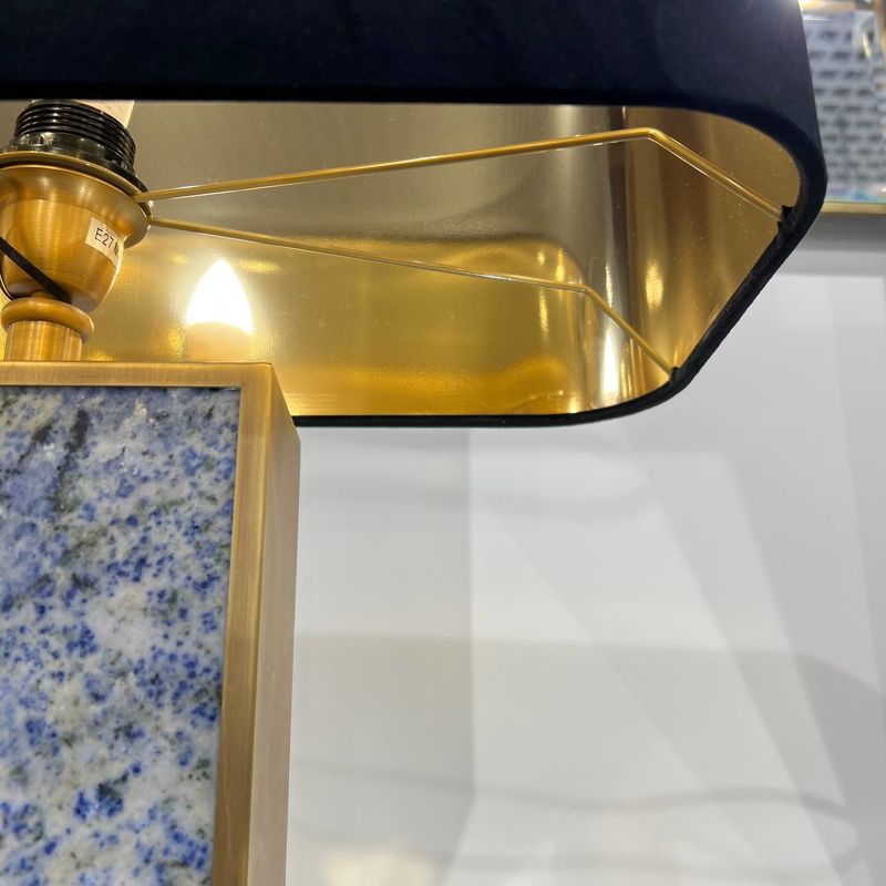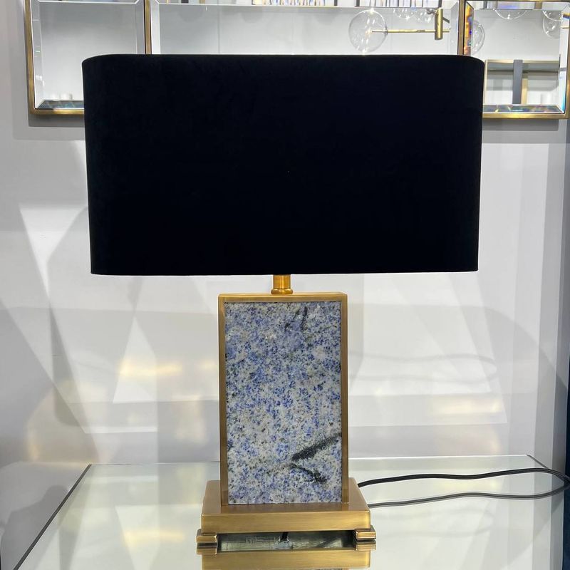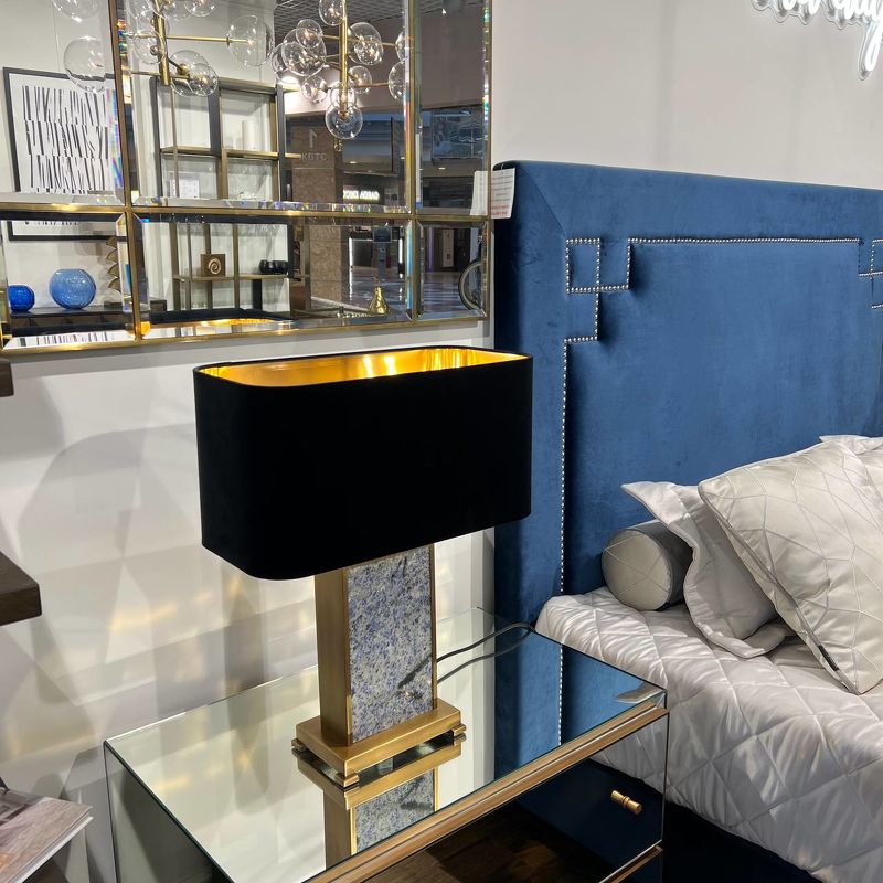 Ее прямоугольное основание из черного мрамора заключено в металлический каркас с отделкой из античной латуни. Эта лампа в комплекте с прямоугольным абажуром из черного бархата с золотистой внутренней поверхностью идеально подходит для установки по бокам дивана или кровати.