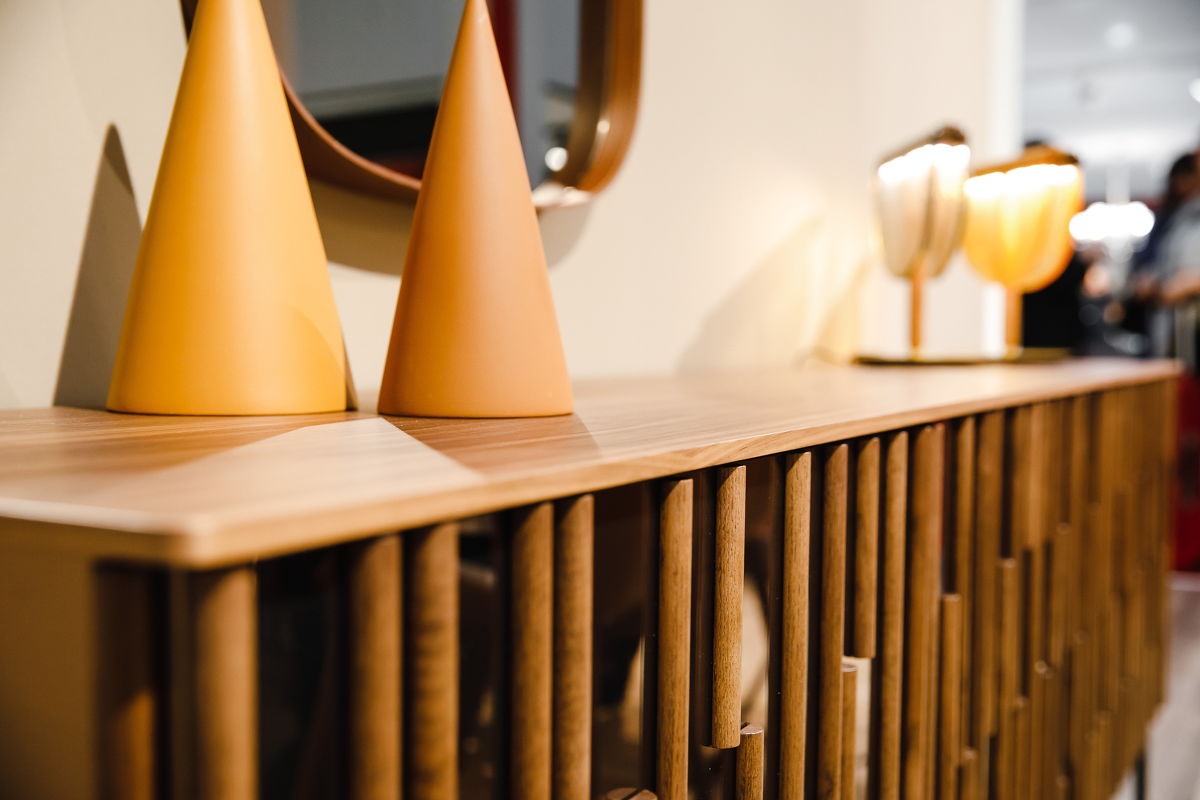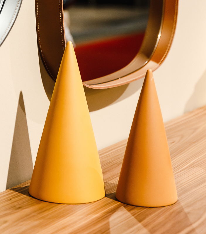Декоративный элемент в виде конуса выполнен в современном стиле из керамики.