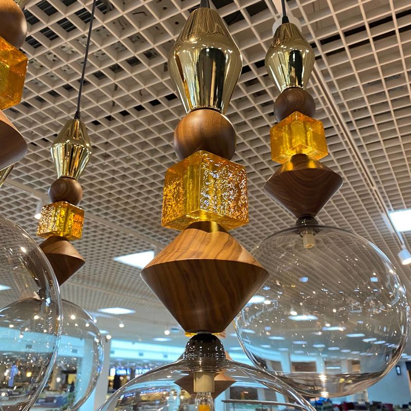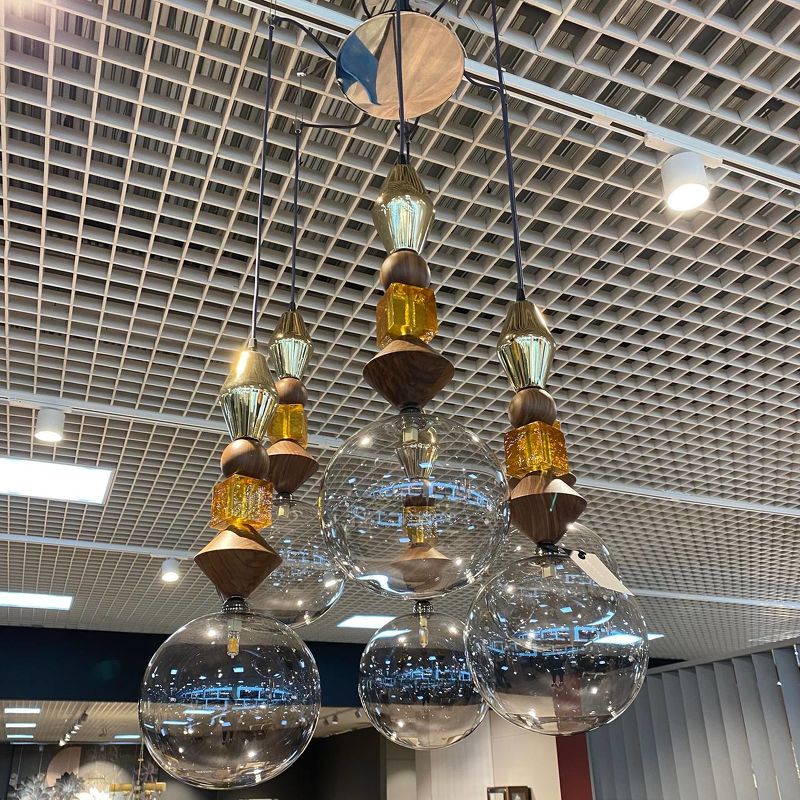 Люстра на длинном подвесе выполнена в стиле модерн. Шесть фигурных плафонов вместе создают эффектное освещение. Плафоны декорированы вставками из массива дерева и тонированного стекла.
