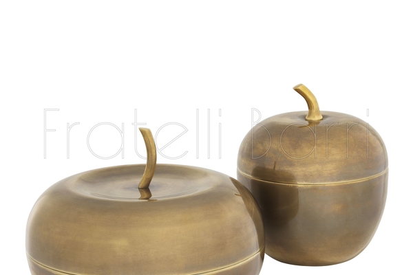 Комплект из двух боксов в виде яблока изготовлен из латуни. Такой декоративный элемент привнесет штрих гламура и элегантности в любое пространство, а коробочка идеально подойдет для хранения сладостей, ключей или мелких безделушек.