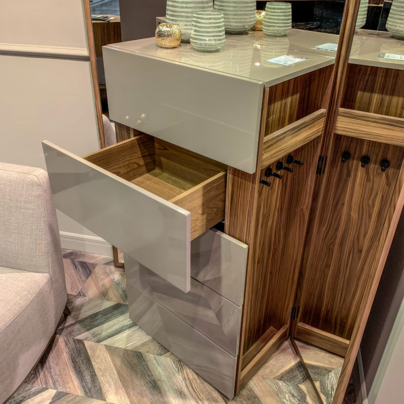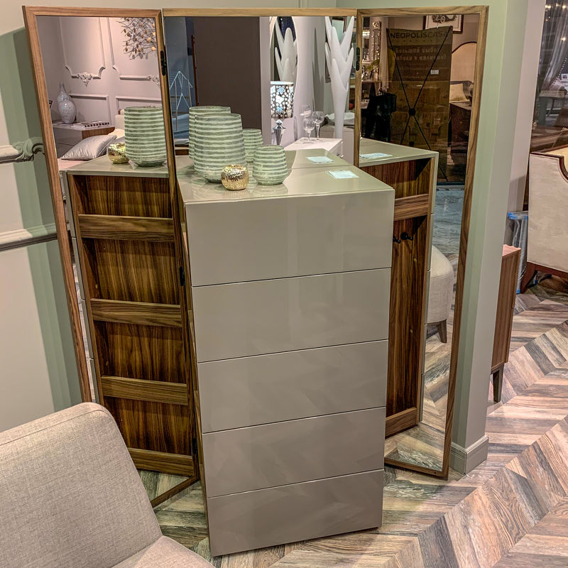 Высокий комод с пятью ящиками из современной коллекции Avila от бренда MOD Interiors. Комод трансформируется — слева и справа есть «крылья» с зеркалами, которые могут раскрываться и открывать доступ к боковым модулям с крючками.