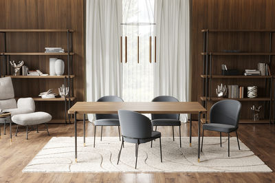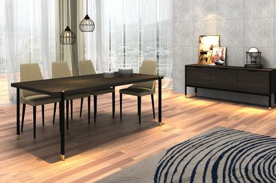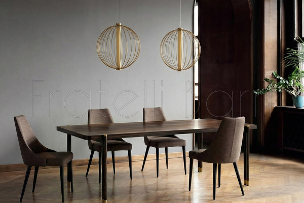 Обеденный стол от бренда Mod Interiors изготовлен из высококачественного шпонированного МДФ высокой плотности. Металлические ножки с латунными колпачками подчеркивают изысканность модели.