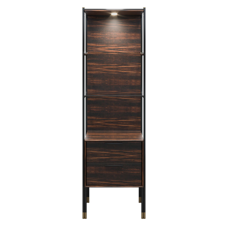 Витрина оснащена двумя выдвижными ящиками, двумя стеклянными полками и подсветкой.