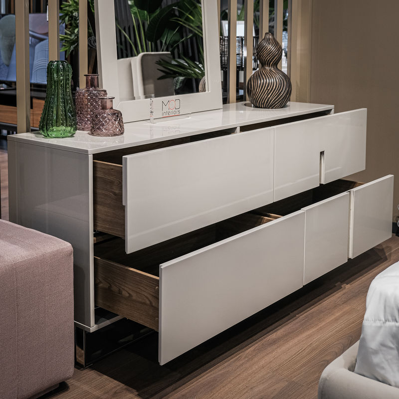 Комод из коллекции Vigo от MOD Interiors — это сочетание эстетики и функциональности, которое станет центральным элементом вашего интерьера. Его гладкая поверхность, покрытая глянцевым серо-бежевым лаком, излучает свет и тепло, придавая пространству уют. Модель выполнена в современном европейском стиле.