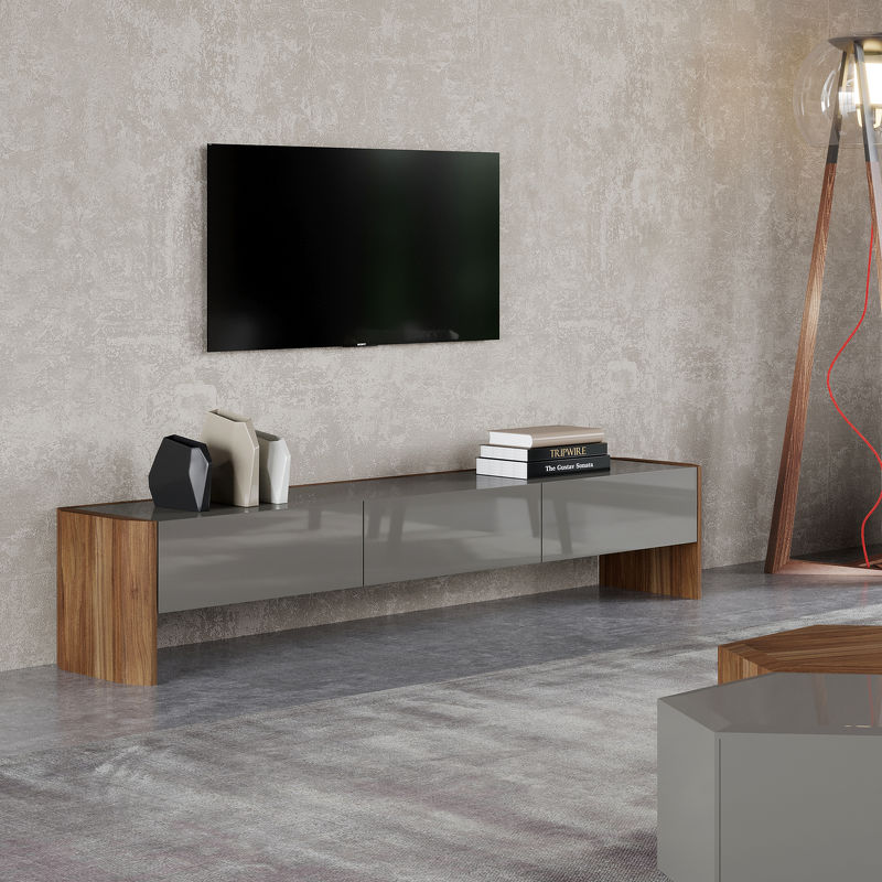 Тумба под TV, отделка шпон ореха F, серый глянцевый лак