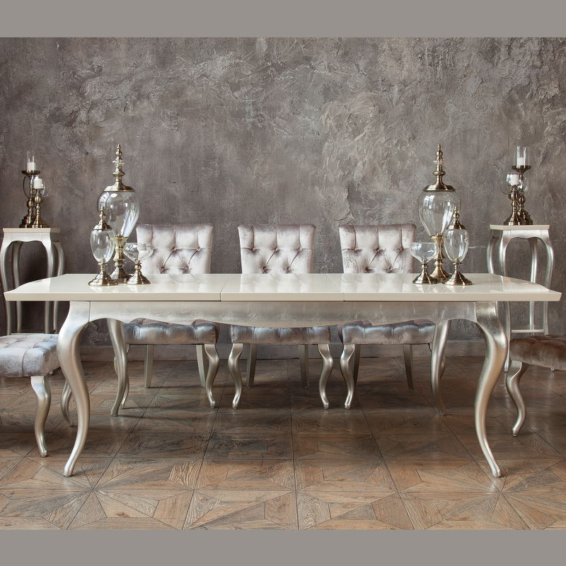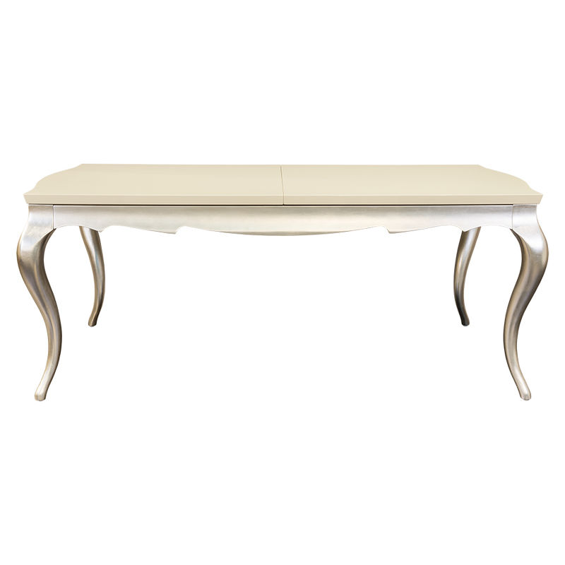 Обеденный стол раздвижной, отделка столешница перламутровый кремовый лак, основание серебряное напыление