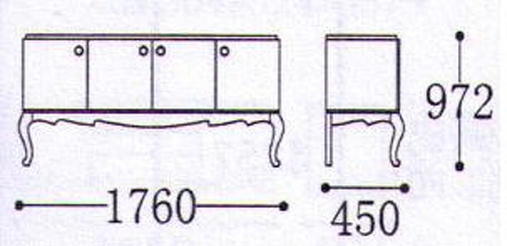 4 распашные дверки. За центральными - 1 узкий ящик для столовых приборов и 1 полка по центру. За боковыми дверками - по 1 полке по центру. Передние ножки изогнутые, задние - прямые, что позволяет поставить буфет плотно к стене.