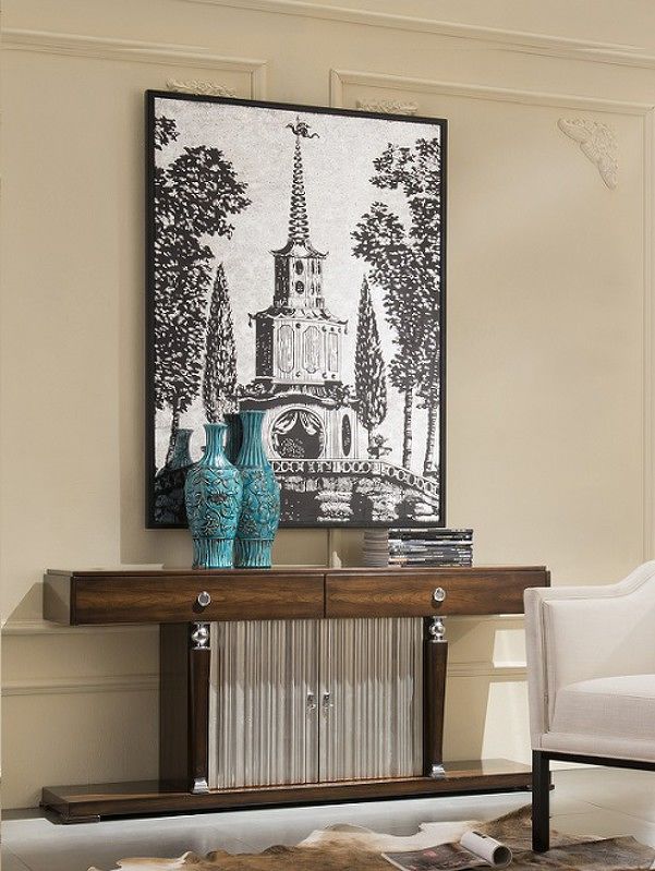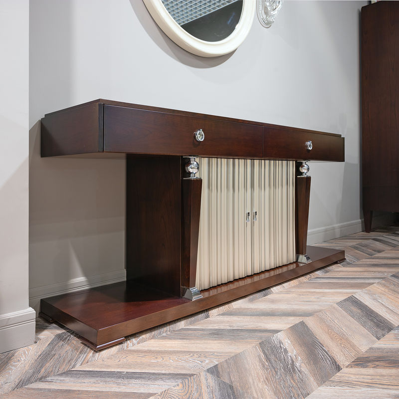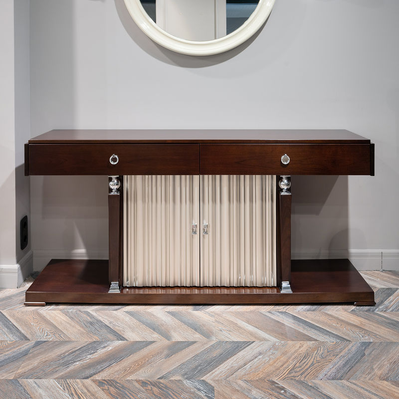 Консоль с 2 ящиками в стиле неоклассика от итальянского бренда Fratelli Barri. Модель имеет фронтальную часть в отделке серебряным напылением. К консоли можно подобрать идентичную по дизайну прикроватную тумбочку, кровать и другую мебель.