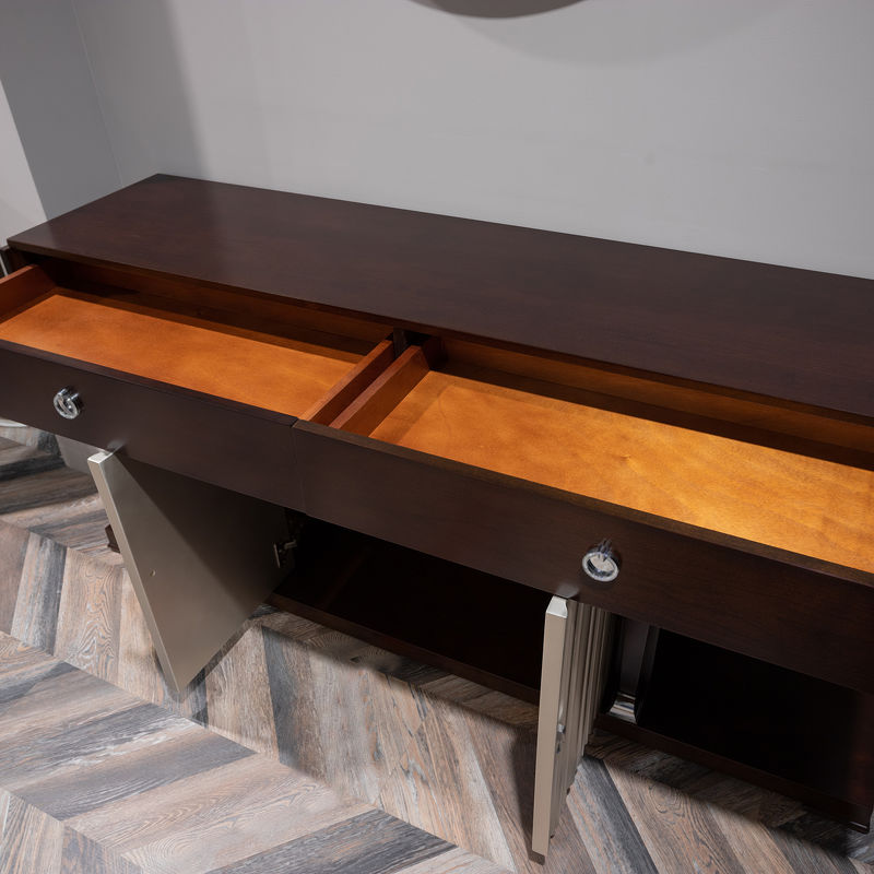 Каркас — массив дерева и высококачественная МДФ высокой плотности, отделка — натуральный шпон вишни. Все выдвижные ящики снабжены направляющими.