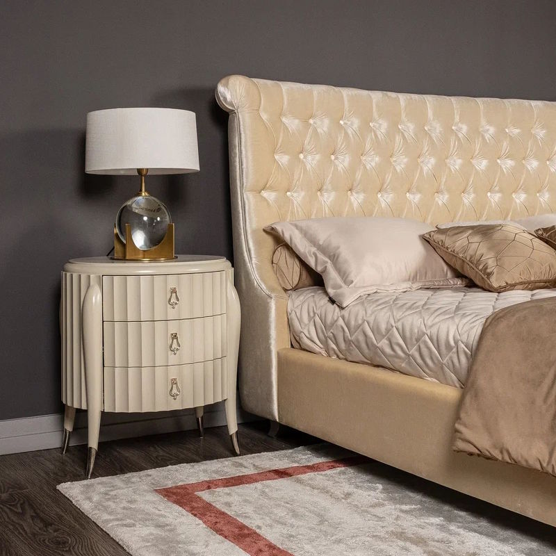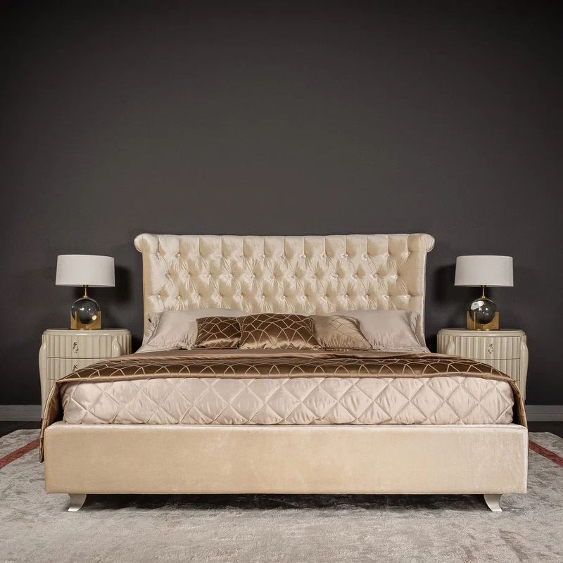 Стильная кровать ар-деко прекрасно впишется в различные интерьерные стили за счет эргономичной конструкции и приятного оттенка обивки. Изголовье декорировано «царской» стежкой капитоне. Заниженные боковины панели загнуты к основанию.