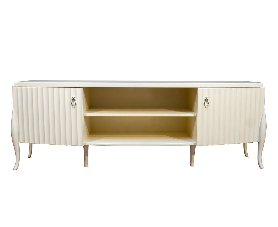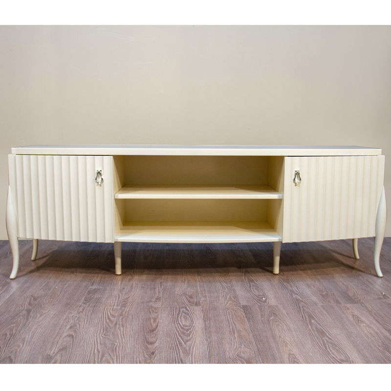 Тумба для ТВ на объемных изогнутых ножках и с модным рифленым фасадом. Модель выполнена в стиле неоклассика с оттенком ар-деко.