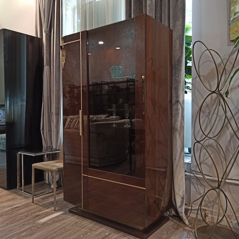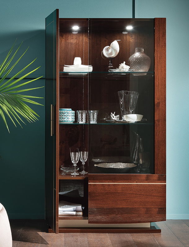 Элегантная витрина Bellagio от итальянской фабрики ALF Italia, с одной стеклянной и одной деревянной створкой. Для отделки использован шпон натурального ореха кофейного оттенка, покрытый глянцевым лаком. Металлические профили цвета розовое золото с округлыми ручками создают оригинальный геометрический мотив.