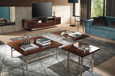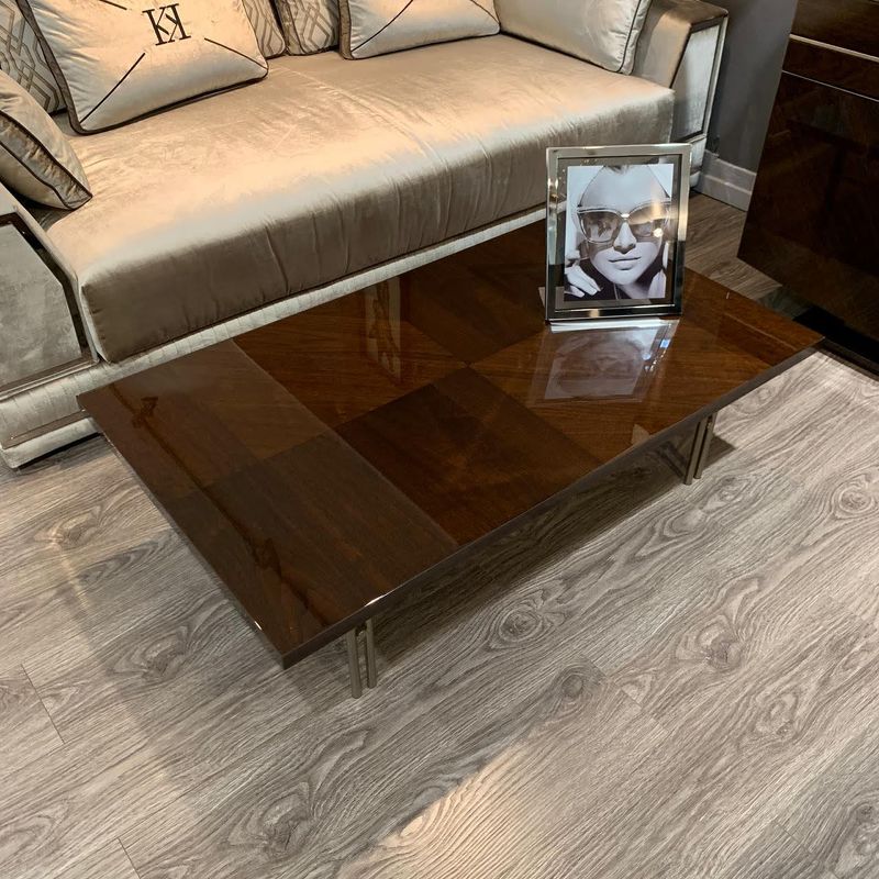 Прямоугольный журнальный столик Bellagio от итальянской фабрики ALF Italia, выполнен в современном стиле. Для отделки использован шпон натурального ореха кофейного оттенка, покрытый глянцевым лаком, металлические ножки цвета розовое золото.