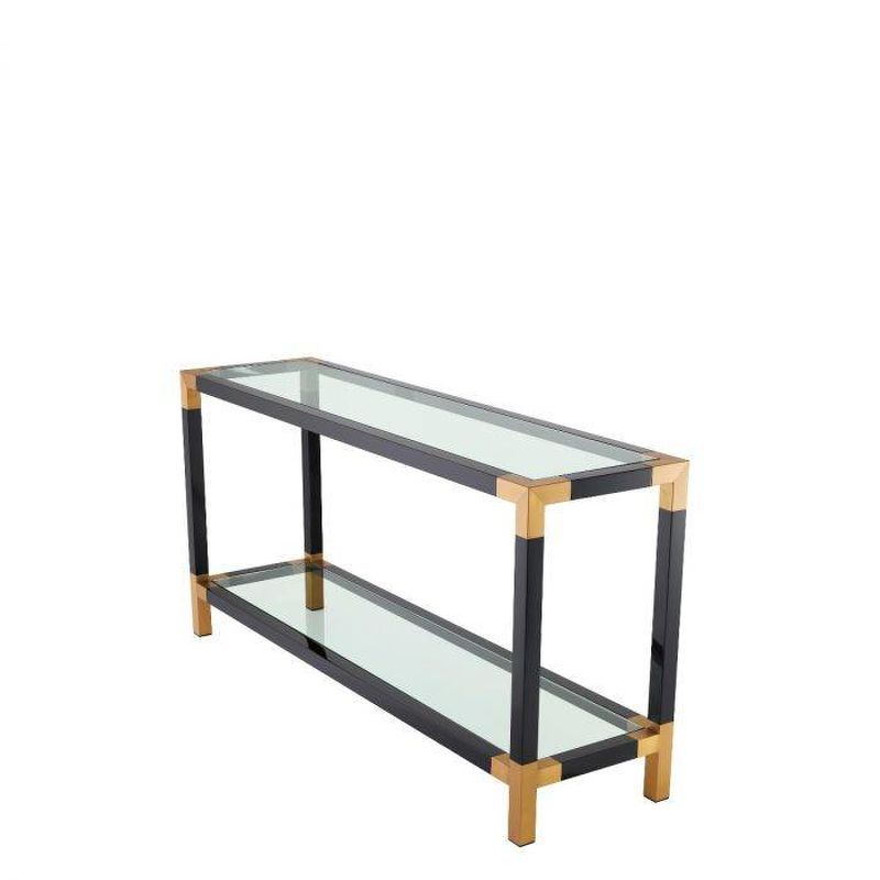 Консоль Royalton от Eichholtz представлена столешницей и полкой из прозрачного стекла, которые крепятся на стойках из черного непрозрачного акрила. Углы и ножки из нержавеющей стали с отделкой из матовой латуни дополняют современную эстетику.