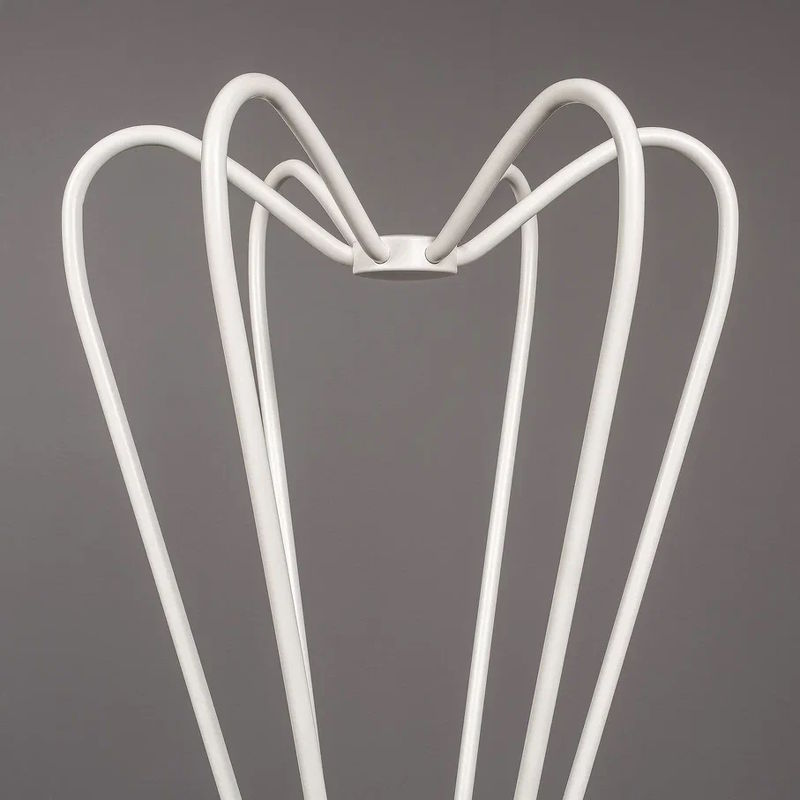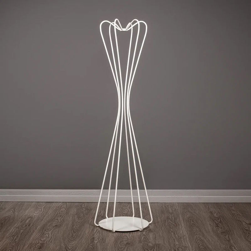 Напольная вешалка для одежды выполнена в современном стиле из окрашенного металла. Фигурная стойка из петель делает конструкцию воздушной, и не утяжеляет интерьер.