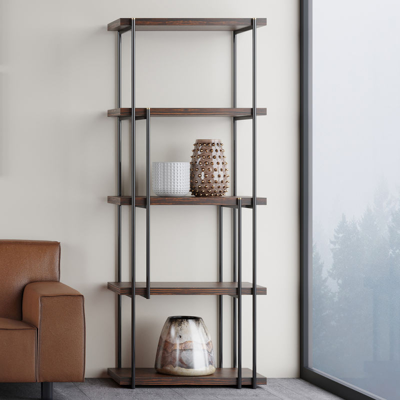 Полки выполнены из высококачественного МДФ. Отделка - натуральный шпон американского ореха. Структура- высококачественный металл в черном матовом лаке, детали в цвете латунь.