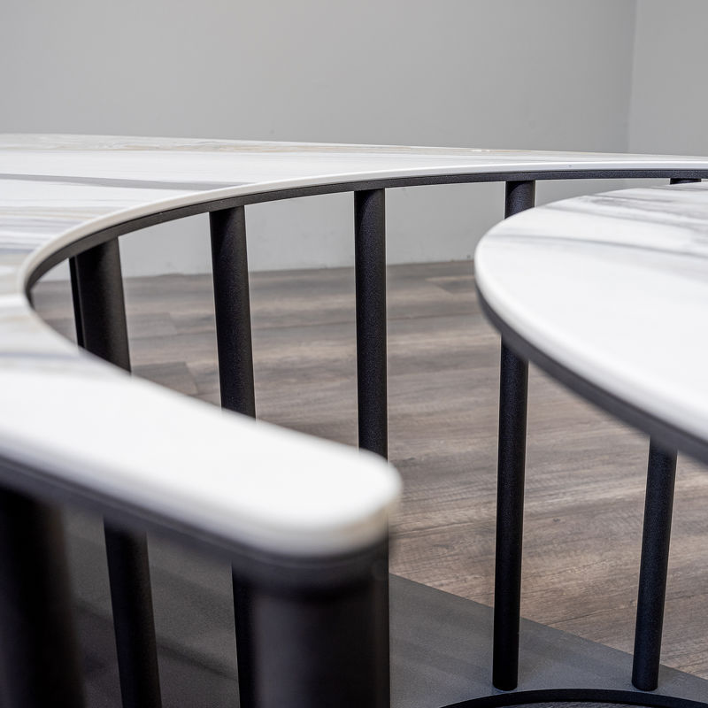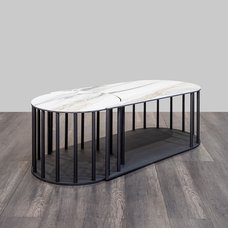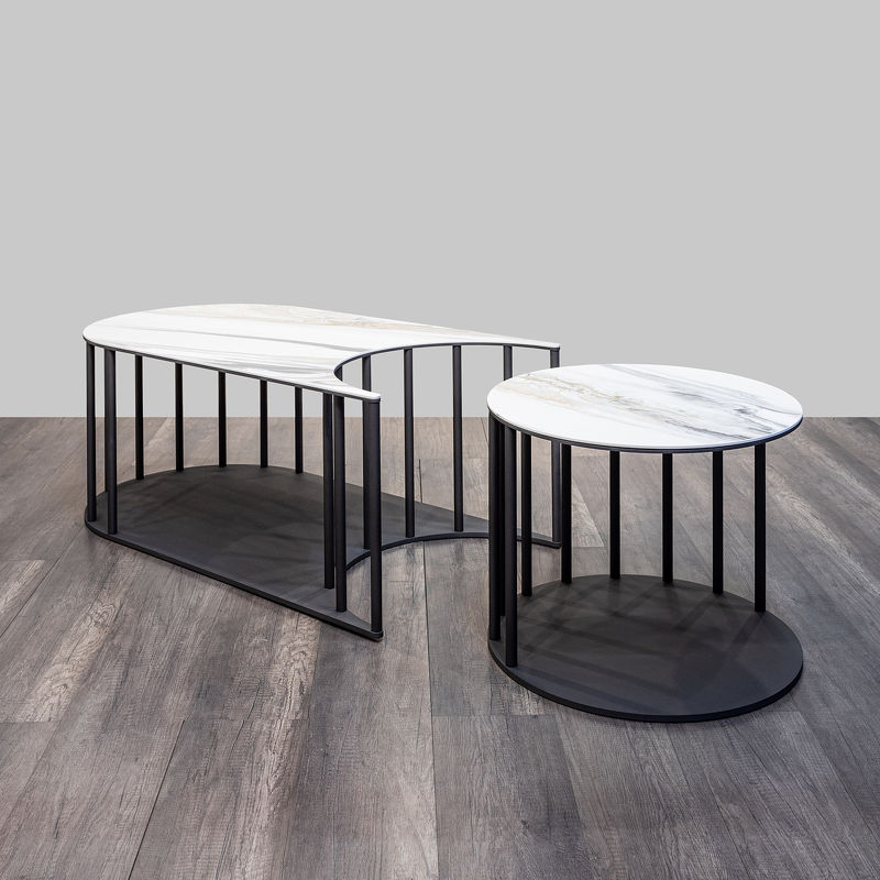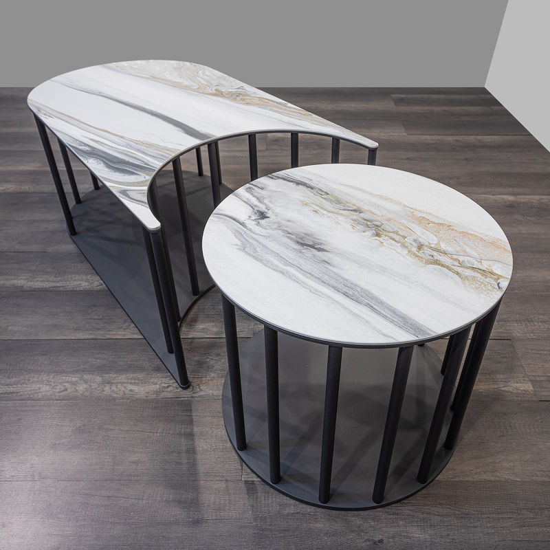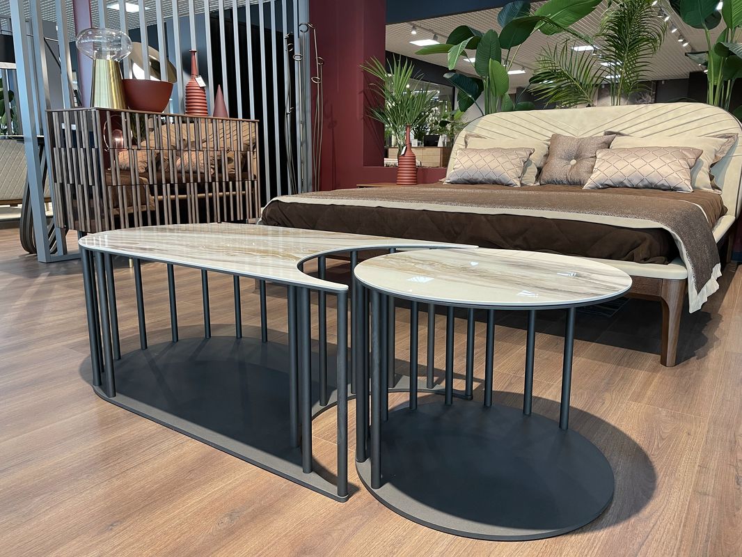 Комплект из двух журнальных столиков на металлическом основании выполнен в стиле модерн. Дополнен столешницей "под мрамор". Комплект состоит из овального столика и маленького круглого столика, которые можно использовать как вместе, так и отдельно.
