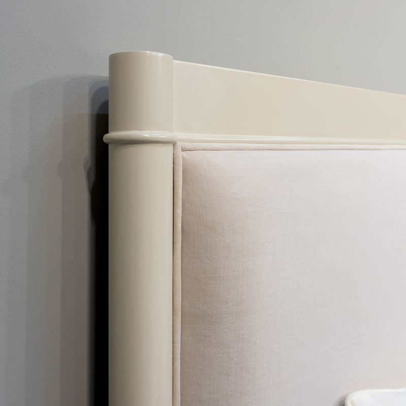 Высокая кровать от итальнякого бренда Fratelli Barri с прямыми ножками и мягким изголовьем в стиле неоклассика. Основание кровати полностью в отделке бежевый матовый лак. На ножках металлические колпачки.