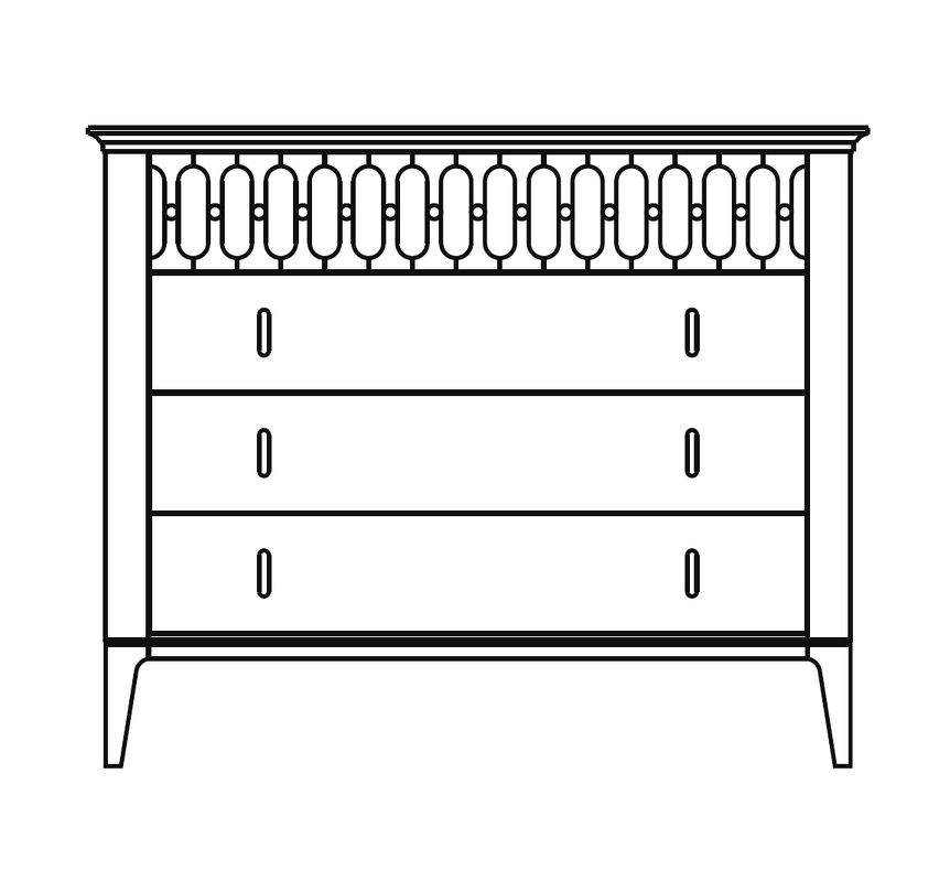 Комод на прямых ножках выполнен в стиле ар-деко. Оснащен четырьмя ящиками, верхний ящик с системой открывания push to open декорирован гравировкой.