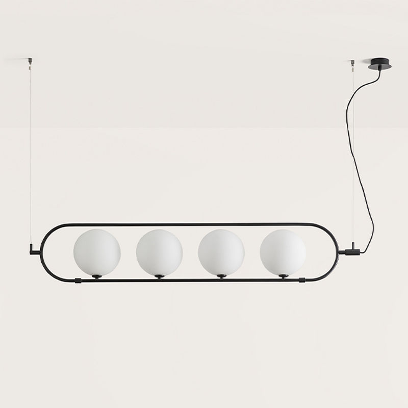 Подвесная конструкция из стали в черном матовом цвете и круглыми плафонами из белого матового стекла.