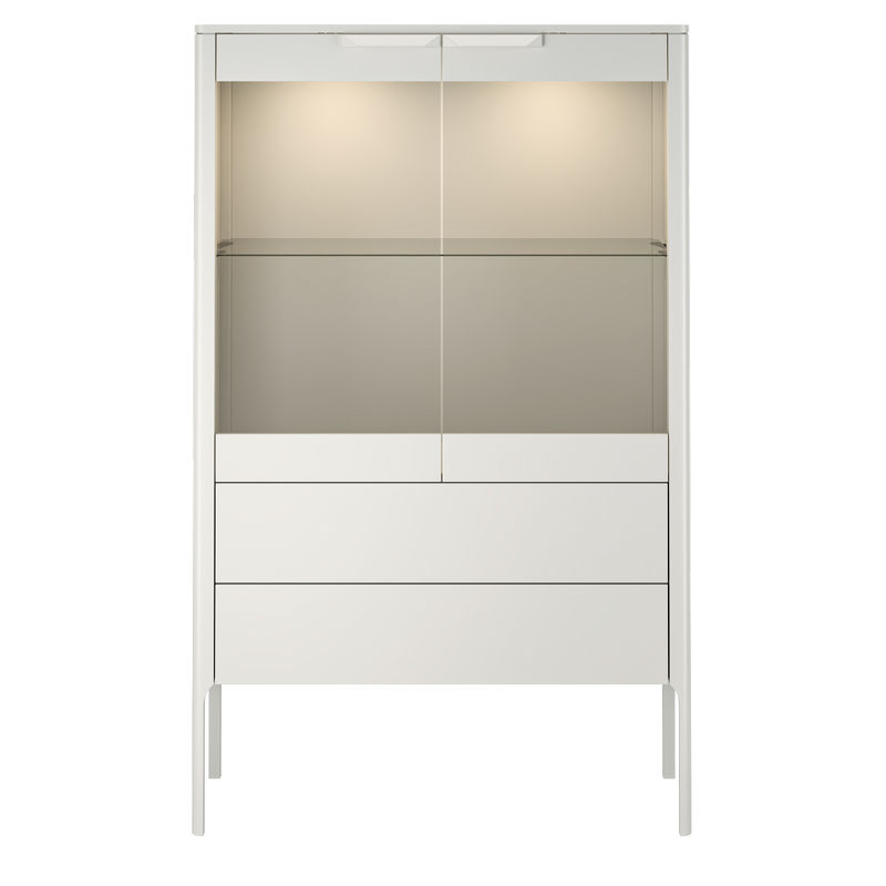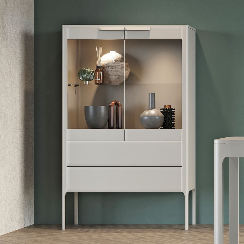 Корпус витрины изготовлен из высококачественного МДФ высокой плотности, Ножки и ручки - из массива дерева.