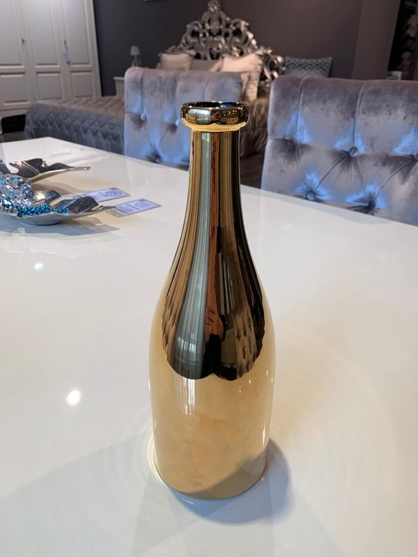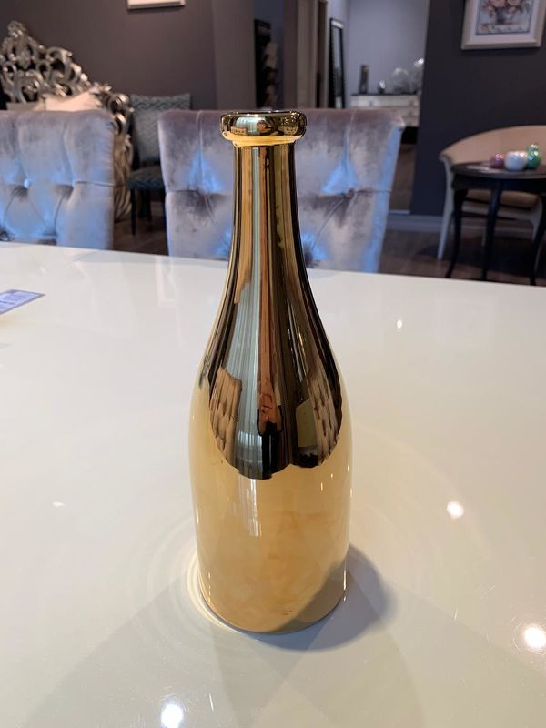 Декоративный элемент в виде бутылки выполнен в современном стиле из керамики.