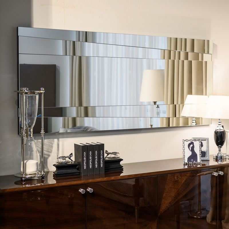 Зеркало выполнено в стиле Ар-деко. Зеркало на каркасе из высококачественного шпонированного МДФ высокой плотности. Декорировано полосами.
