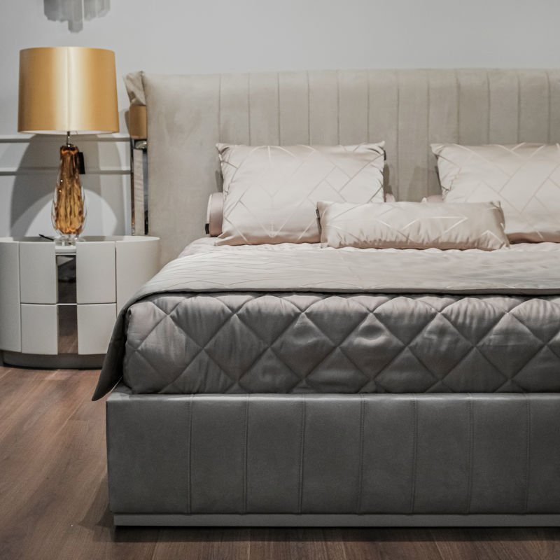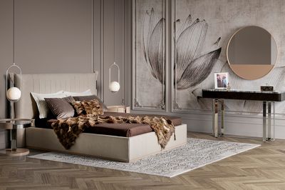 Двуспальная кровать с интересным силуэтом и обивкой изголовья и базы тканью. Модель дополнена вертикальной стежкой и деталями из полированной стали. По бокам изголовья есть необычные «уши», очень популярные в 2024 и 2025 году.