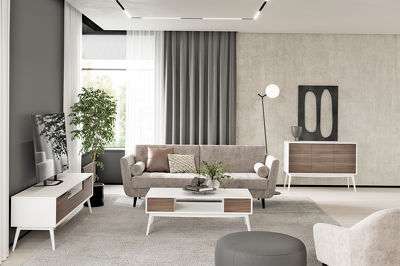 В шпоне американского ореха сочетаются теплые тона и естественная текстура, которые усиливают визуальный магнетизм изделия. Матовый светло-серый лак придает бархатистость, смягчая линии.