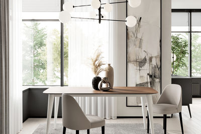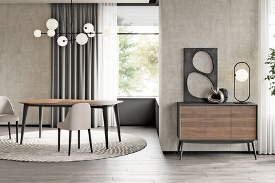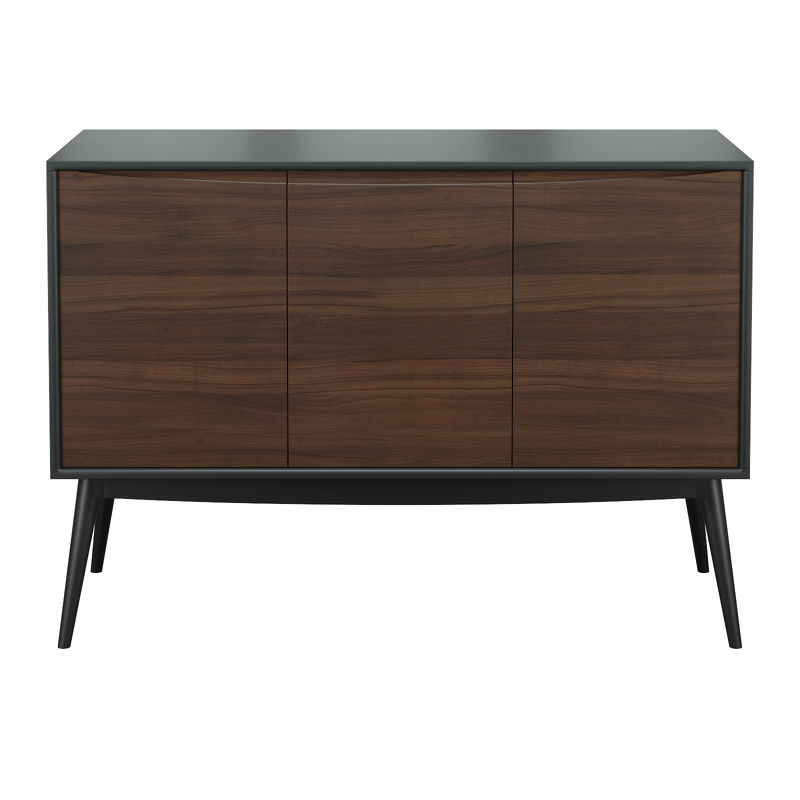 Дизайнерский буфет на высоких ножках из коллекции Sevilla от MOD Interiors — сочетание современного дизайна, где геометрическая простота форм сочетается с благородством отделки. Изготовленный из МДФ с отделкой в шпоне американского ореха и матовым серым лаком, он привносит в интерьер визуальную легкость.