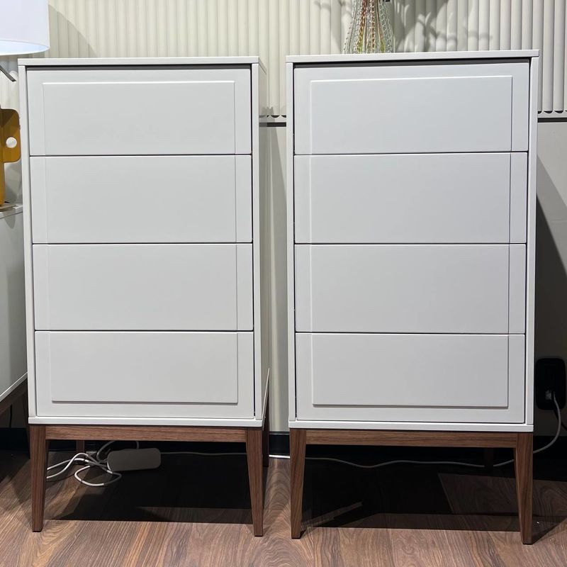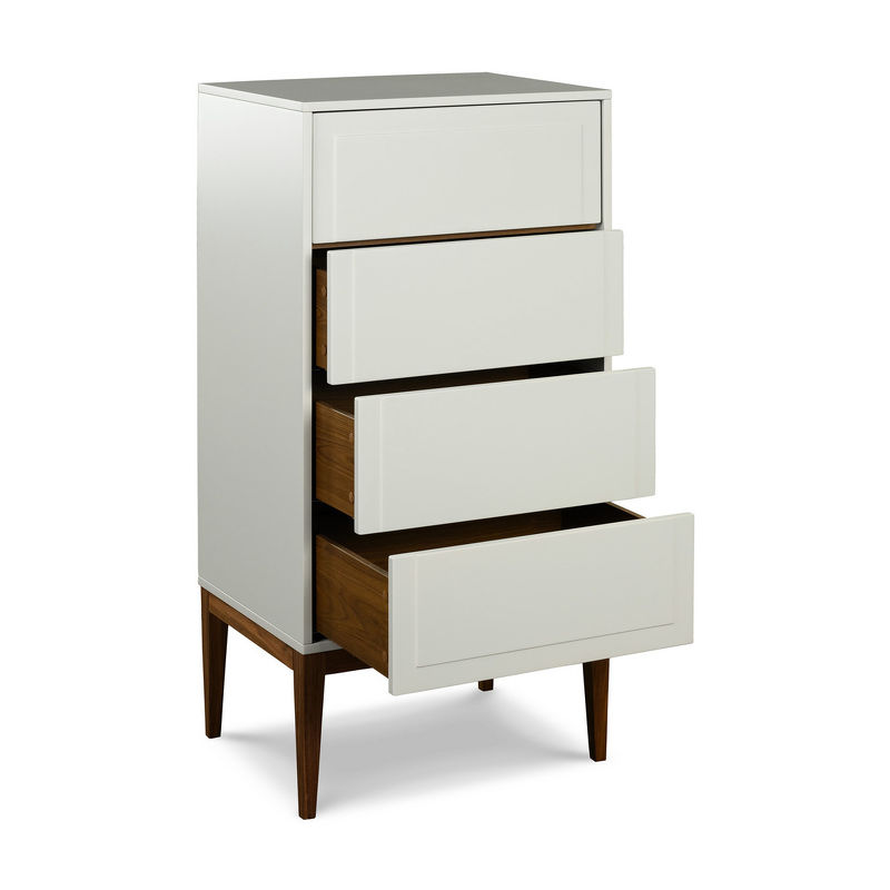 Высокий комод с четырьмя ящиками, на высоких ножках из коллекции Marbella от бренда MOD Interiors. Лаконичные фасады с интересной фрезеровкой.