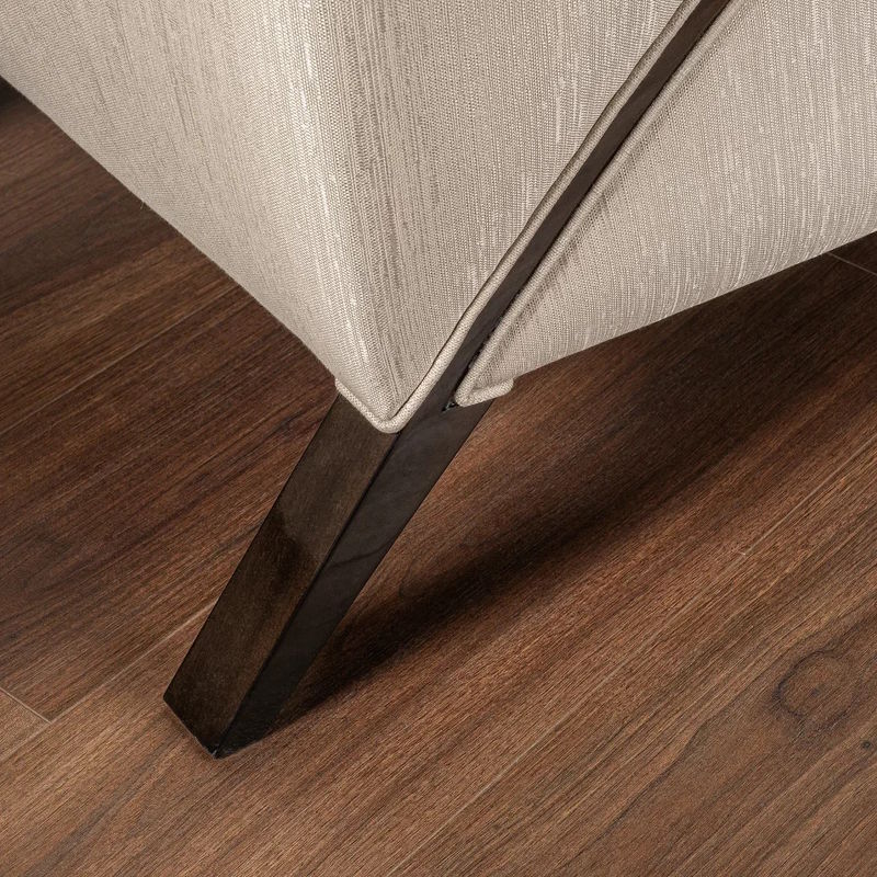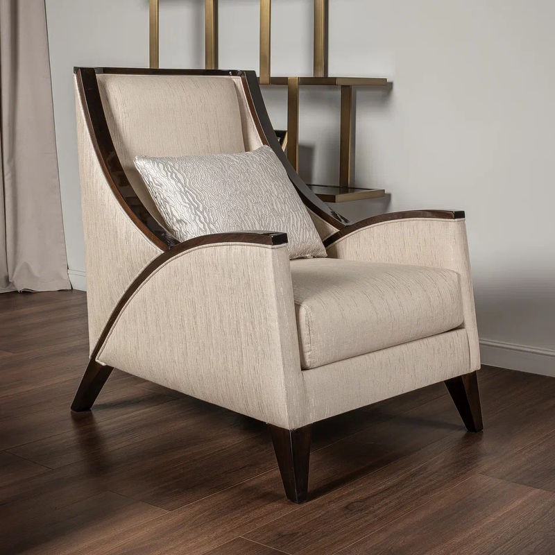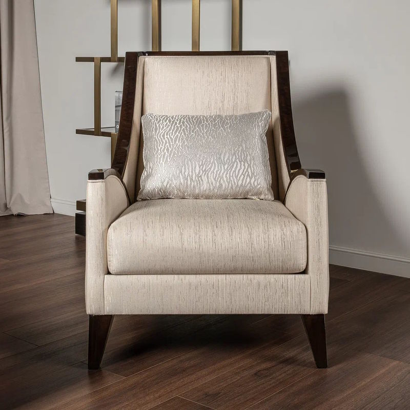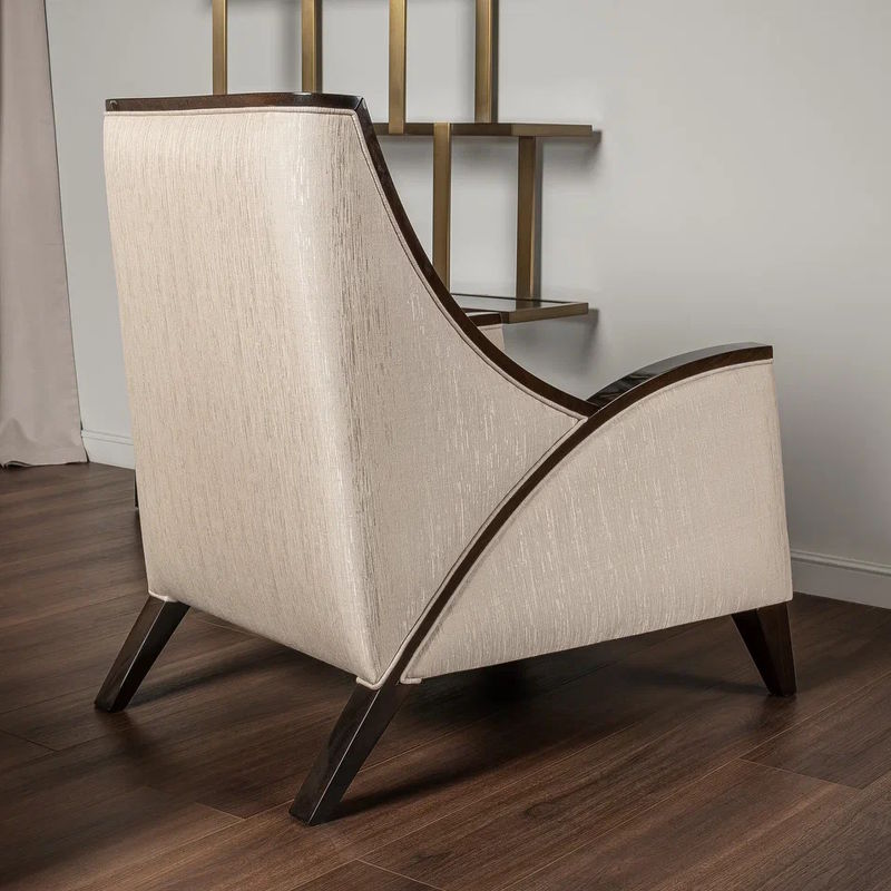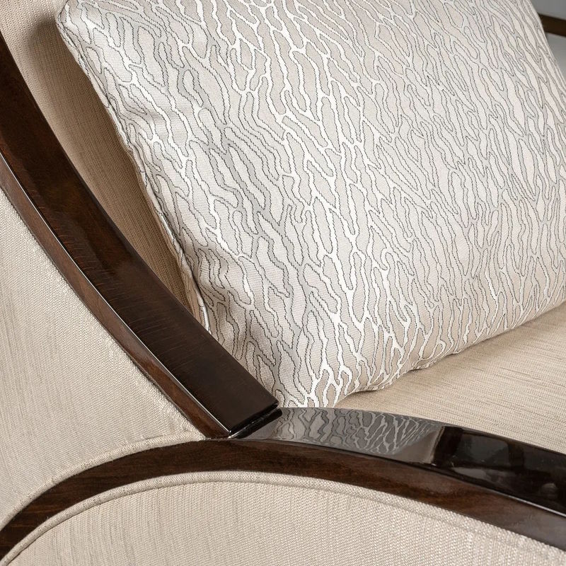 Кресло выполнено в стиле Ар-деко. Каркас изготовлен из массива бука. Наполнитель пенополиуретан, ножки массив бука. Кресло обито тканью из ассортимента фабрики в светло-бежевых тонах. Тип ткани - жаккард. Состав ткани 66% полиэстер, 34% хлопок.