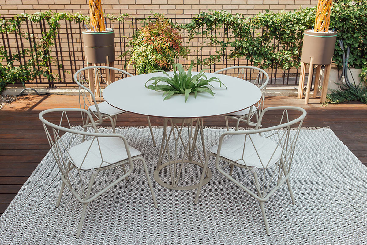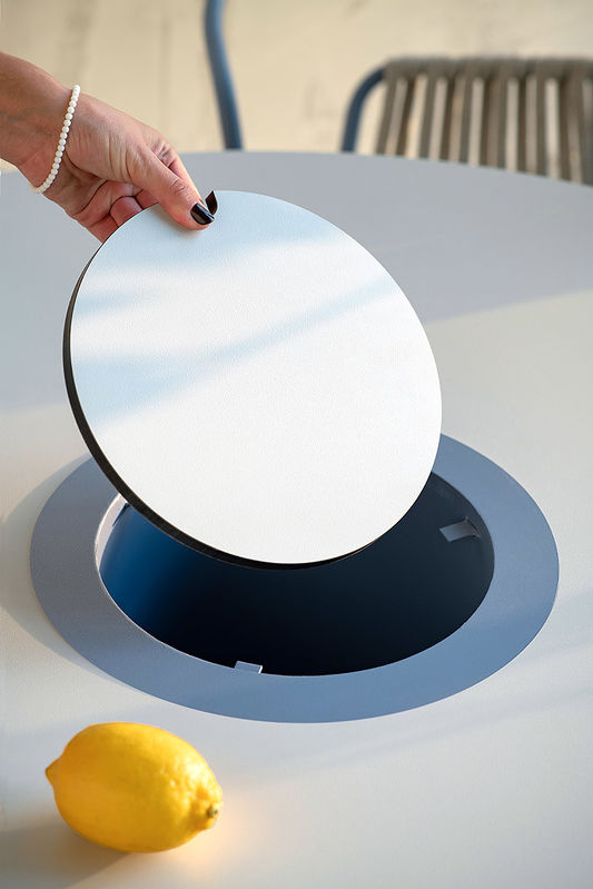 Обеденный стол Ataman изготовлен из металла, который подвергается специальной антикоррозийной обработке. Конструкция дополнена тонкой столешницей из HPL (ламинат высокого давления), которая имеет посередине встроенную вазу, позволяющую охлаждать в ней шампанское или выращивать растение.