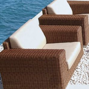 Кресло Pacific, отделка искусственный ротанг кофейного цвета, ткань подушек лен цвета шампань