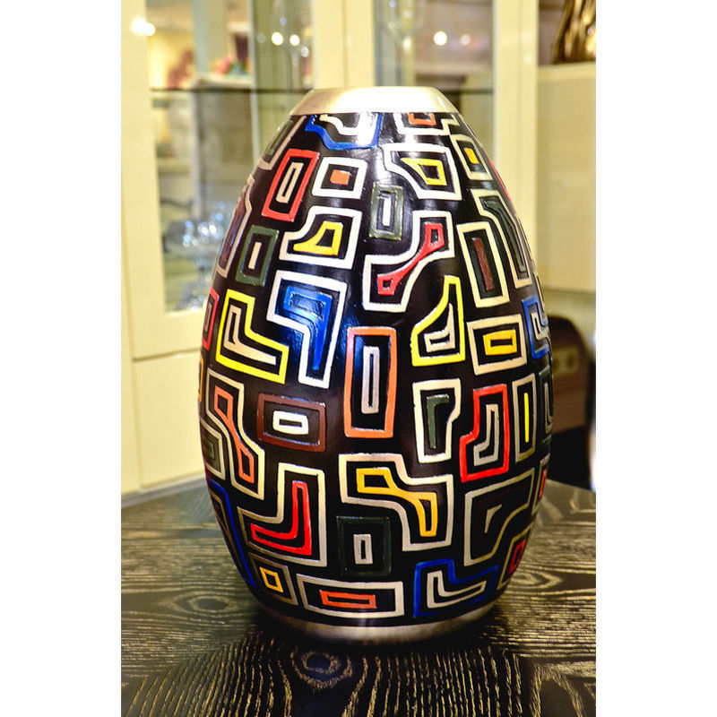 Ваза выполнена в оригинальной овальной форме. Несмотря на свои небольшие размеры, она будет видна в любом месте домашнего интерьера. Причиной этому являются контрастные цвета, использованные в этой композиции.