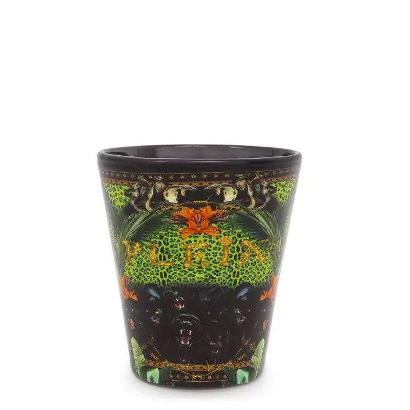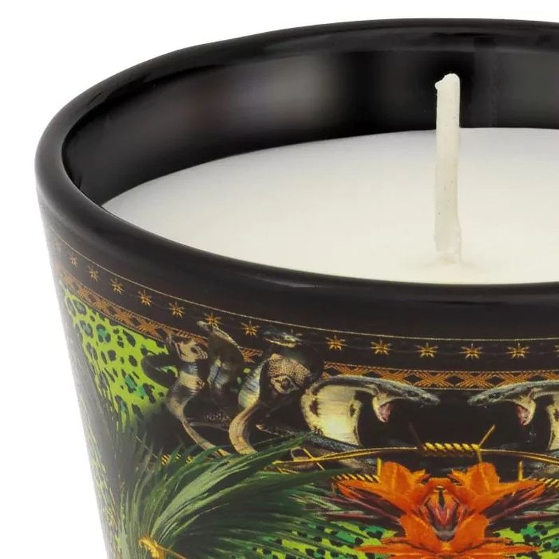 Подсвечник из дутого стекла, украшен индивидуальным принтом Jungle с изображением экзотических зверей и тропических растений. Вылитая восковая свеча имеет тонкий аромат.