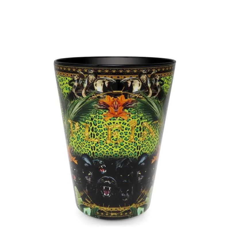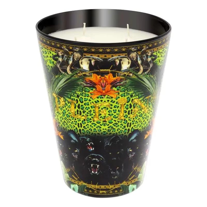 Подсвечник из дутого стекла, украшен индивидуальным принтом Jungle с изображением экзотических зверей и тропических растений. Вылитая восковая свеча имеет тонкий аромат.