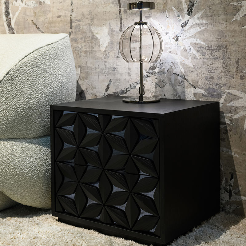 Прикроватная тумбочка с двумя ящиками от фабрики Tonin Casa выполнена из дерева. Дверки декорированы зеркалом.