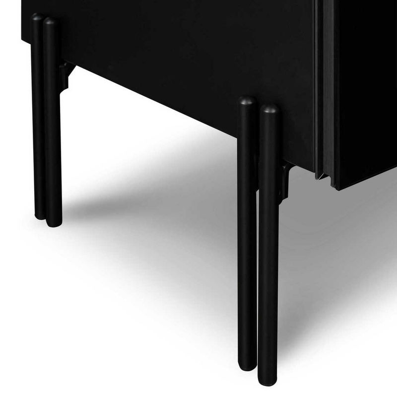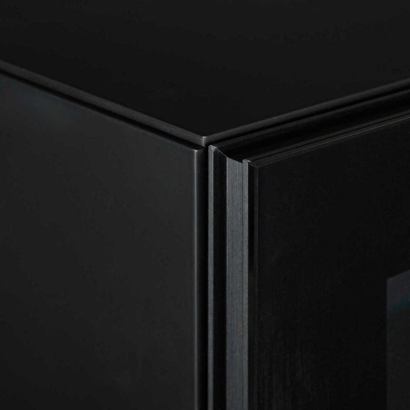 Витрина выполнена в современном стиле с двумя стеклянными дверками.