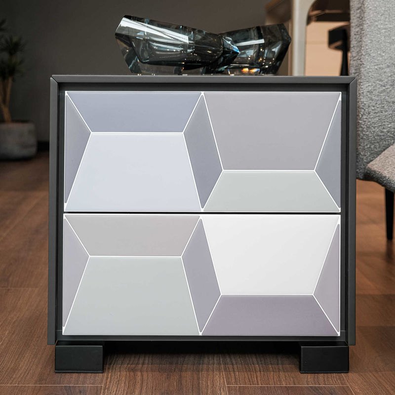 Прикроватная тумбочка с двумя выдвижными ящиками выполнен в современном стиле. Фасады декорированы мозаикой.
