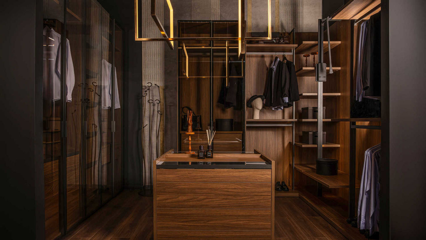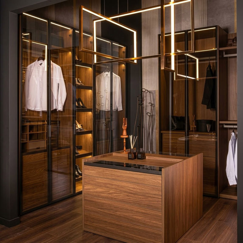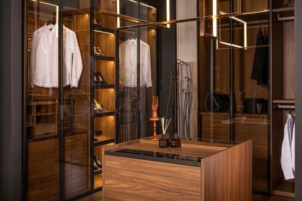 Гардероб выполнен в современном стиле. Гардероб со стеклянными распашными дверками оснащен штангами для одежды, комодом с выдвижными ящиками, открытыми полками и подсветкой.