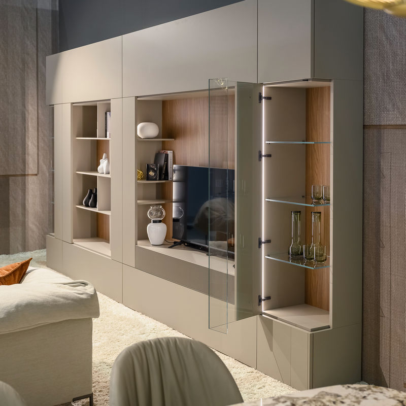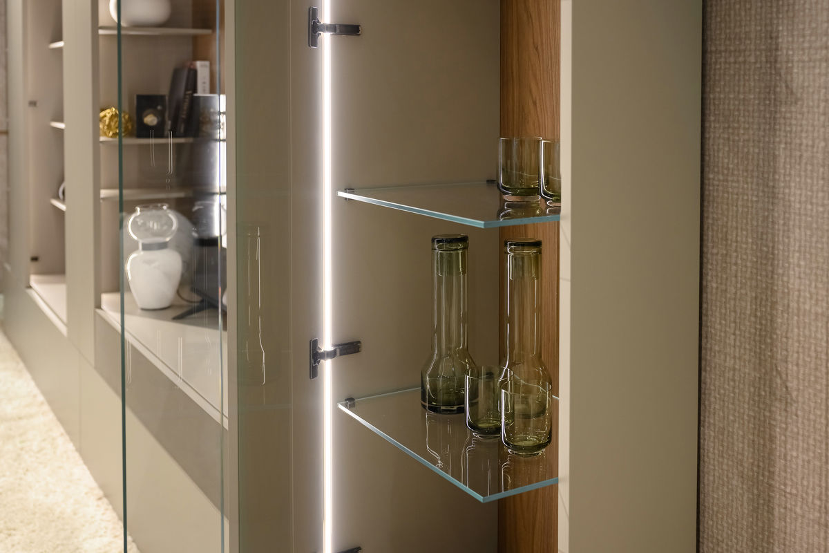 Книжный шкаф, отделка матовый лак Sabbia, орех, прозрачное стекло