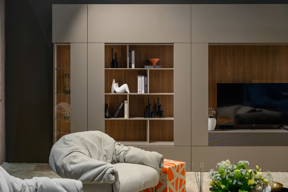 Книжный шкаф выполнен в современном стиле. Шкаф оснащен стеклянными и деревянными дверками и открытыми полками.